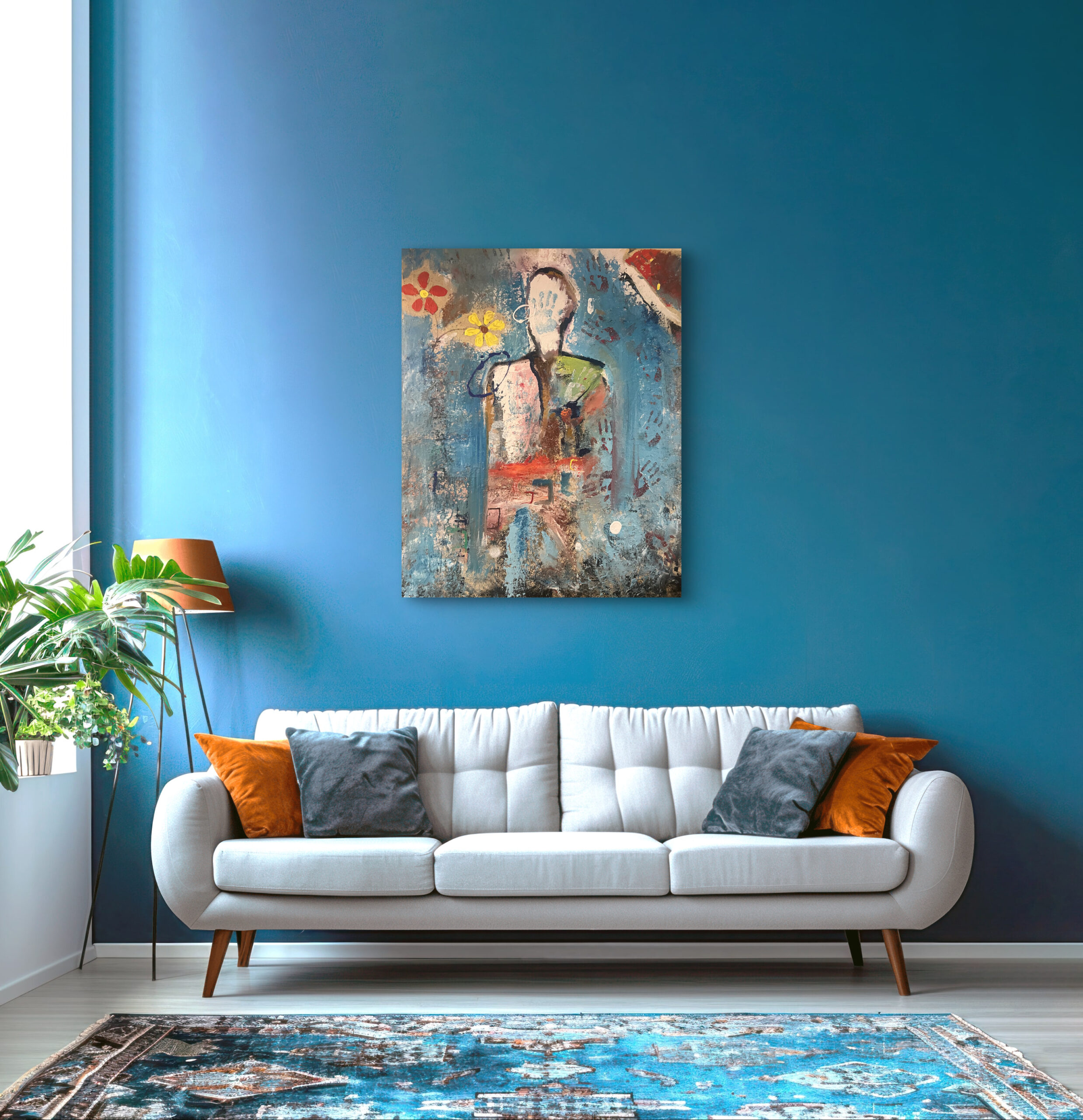 • The central figure is abstract and archetypal, not a specific person. It has the raw, symbolic quality of the anthropomorphic figures found in prehistoric art, which often represented shamans, spirits, or foundational myths.